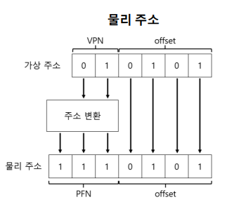 따라서 offset은 그대로 copy하고, VPN(가상 페이지 번호)를 주소 변환을 통해 물리주소의 PFN(페이지 프레임 넘버)로 매핑 시켜주면 되겠다.