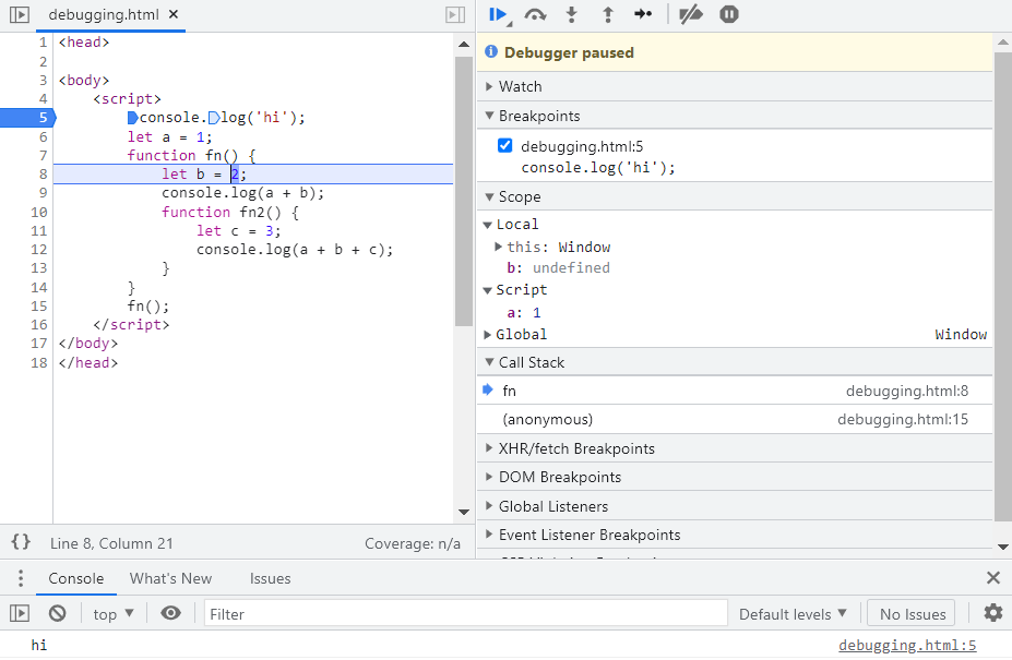 지금은 함수 내부를 디버깅 하는 상태이니 함수 내부에 변수 b가 Local로 분류 된 모습이다.