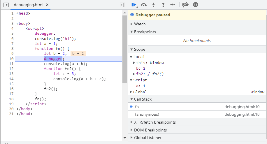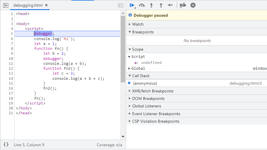 그리고 위에서 언급했듯이 파랑색 버튼을 클릭하면 다음 debugger 코드까지 실행하게 된다.(만약 다음 debugger가 없다면 끝까지 실행)