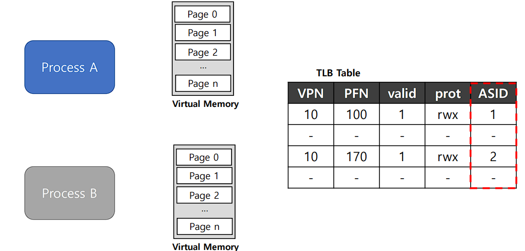 이를 해결하기 위해 문맥 교환을 수행할 때 기존 TLB 내용을 Clear 하는 방식을 고안했지만, 문맥 교환시마다 claer를 수행 하는것은 비용적으로 부담이 된다.