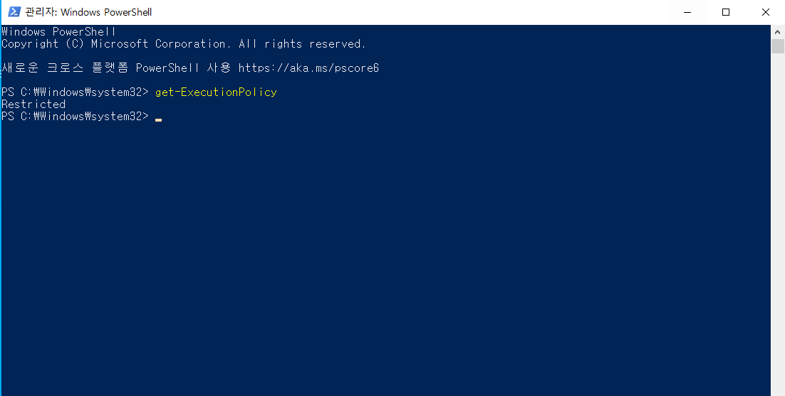 2. get-ExecutionPolicy 명령어를 통해 현재 버전을 확인한다.