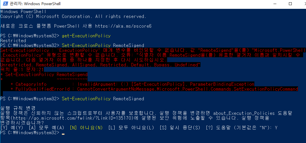 3. Set-ExecutionPolicy RemoteSigned 명령어를 통해 권한변경